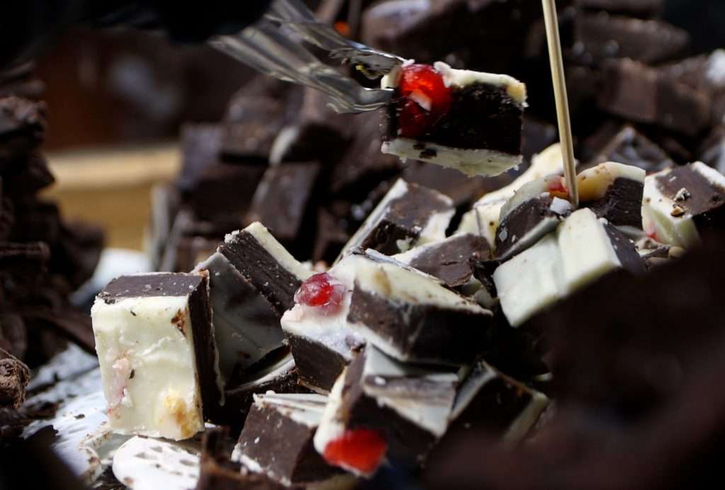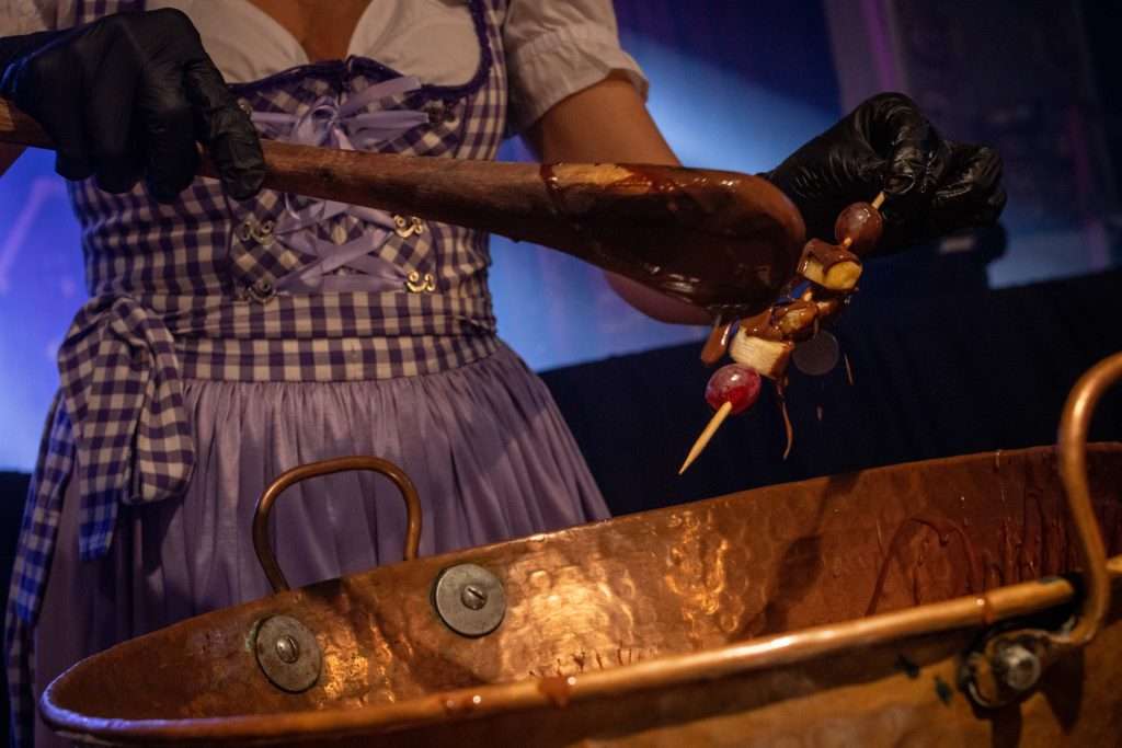 Cada sábado, la tradicional fondue de chocolate se comparte con el público presente, convirtiéndose en uno de los momentos más esperados de la fiesta.